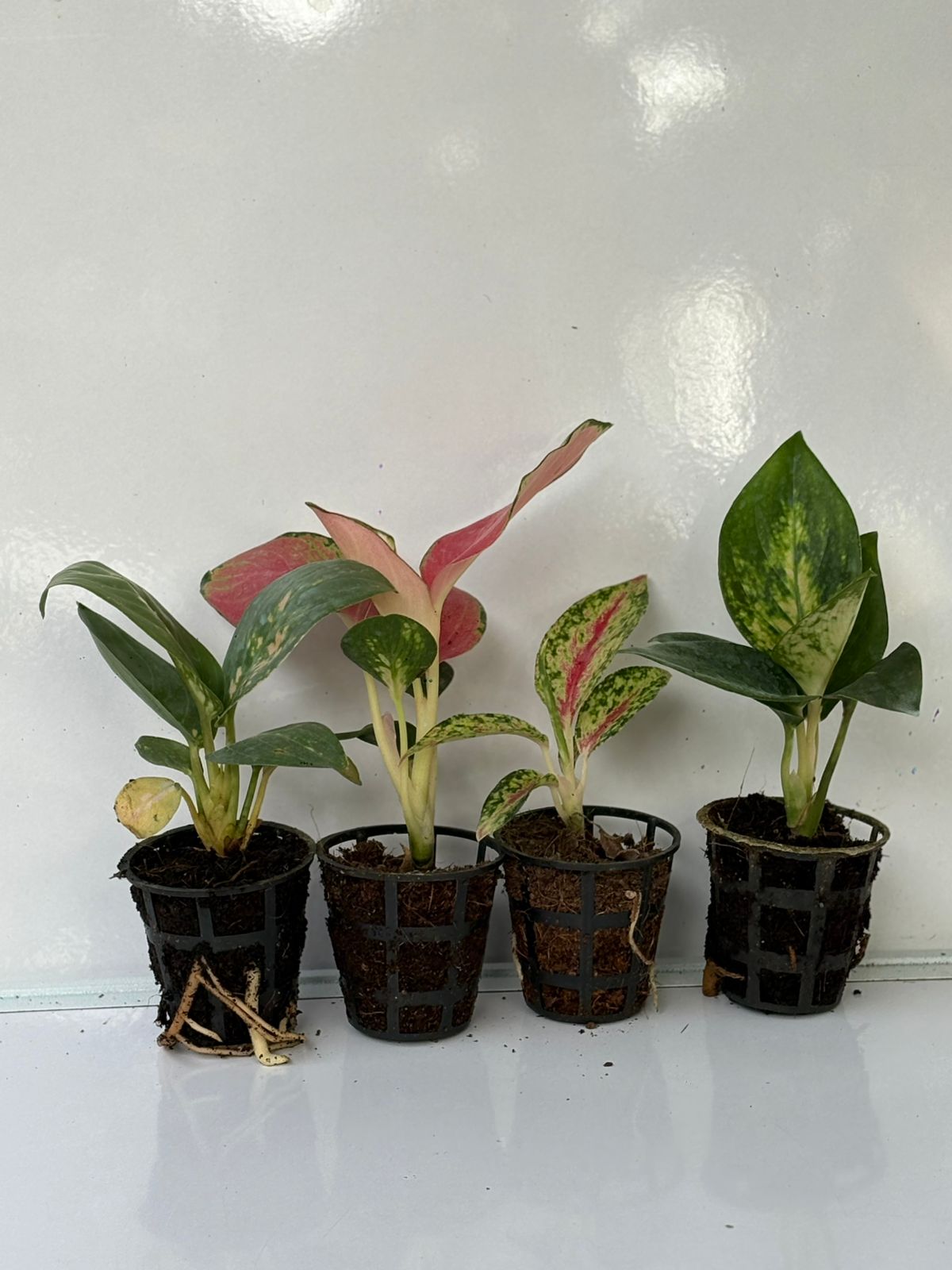 A healthy AGLONEMACOCHIN ESCADE ,CHAINA RED,PINK BANANA,FIRE RED IN NET POTNET POT, SIZE 5-8 CM
